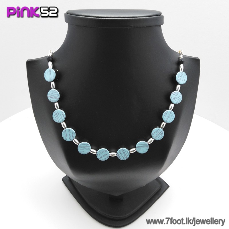 Blue button with black lines bead necklace.