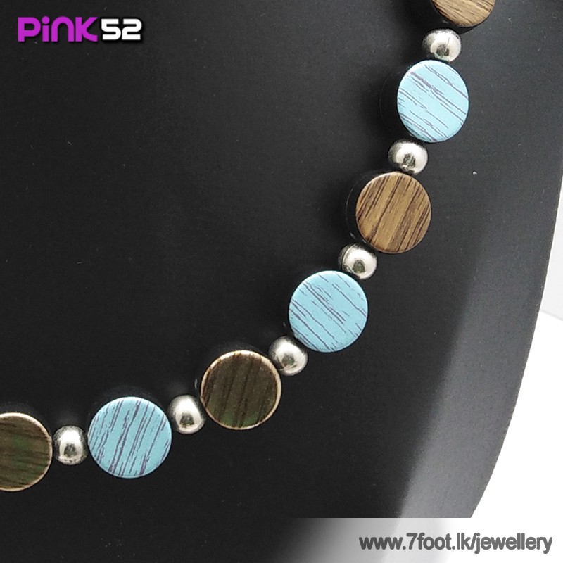 Blue and brown wood textured bead necklace