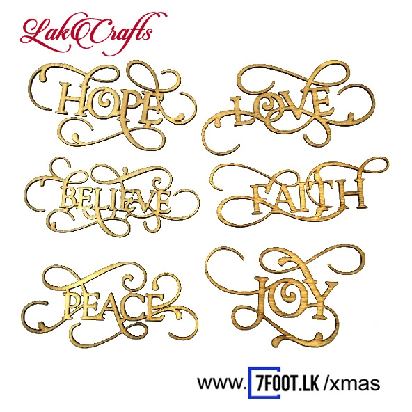 Words chrismas tree emblishment. 6 pieces. plywood. Laser cut. 2.2mm thick each. aproximate size of a piece 150mm*70mm