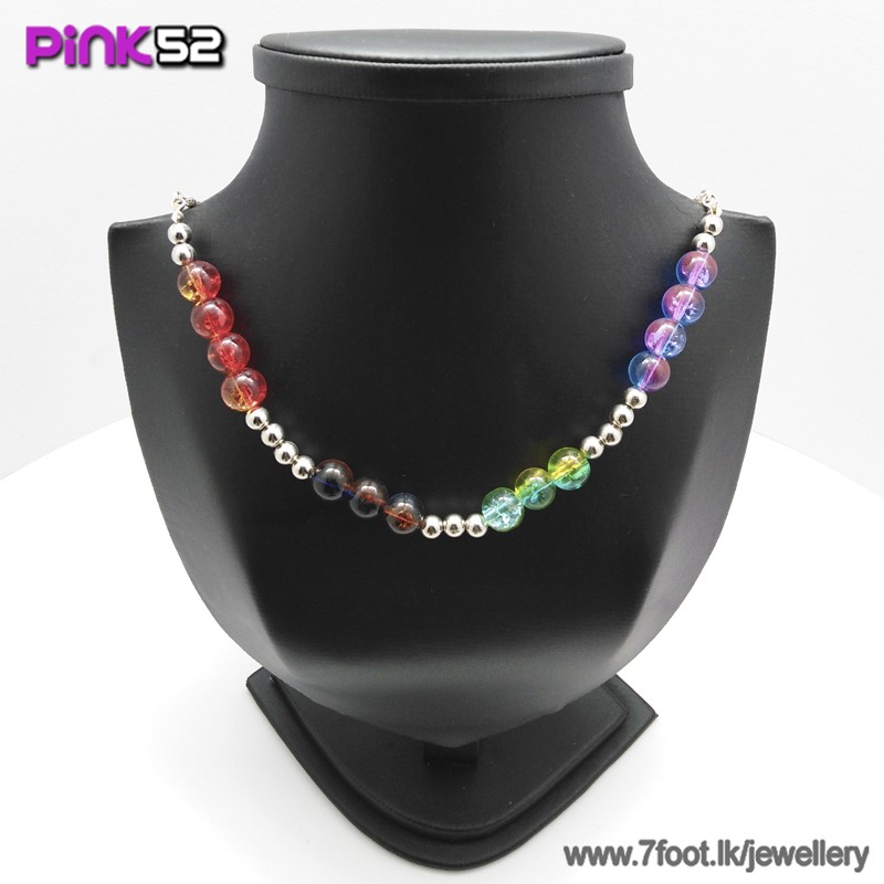 Red/green/purple glossy bead necklace.